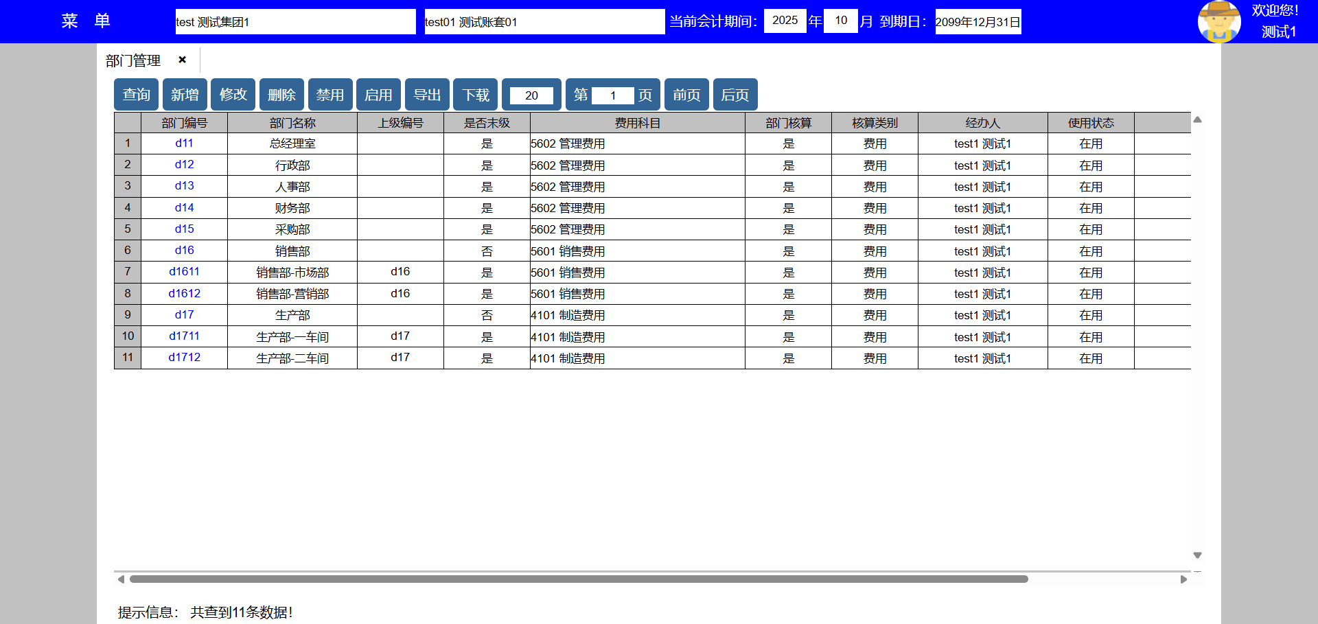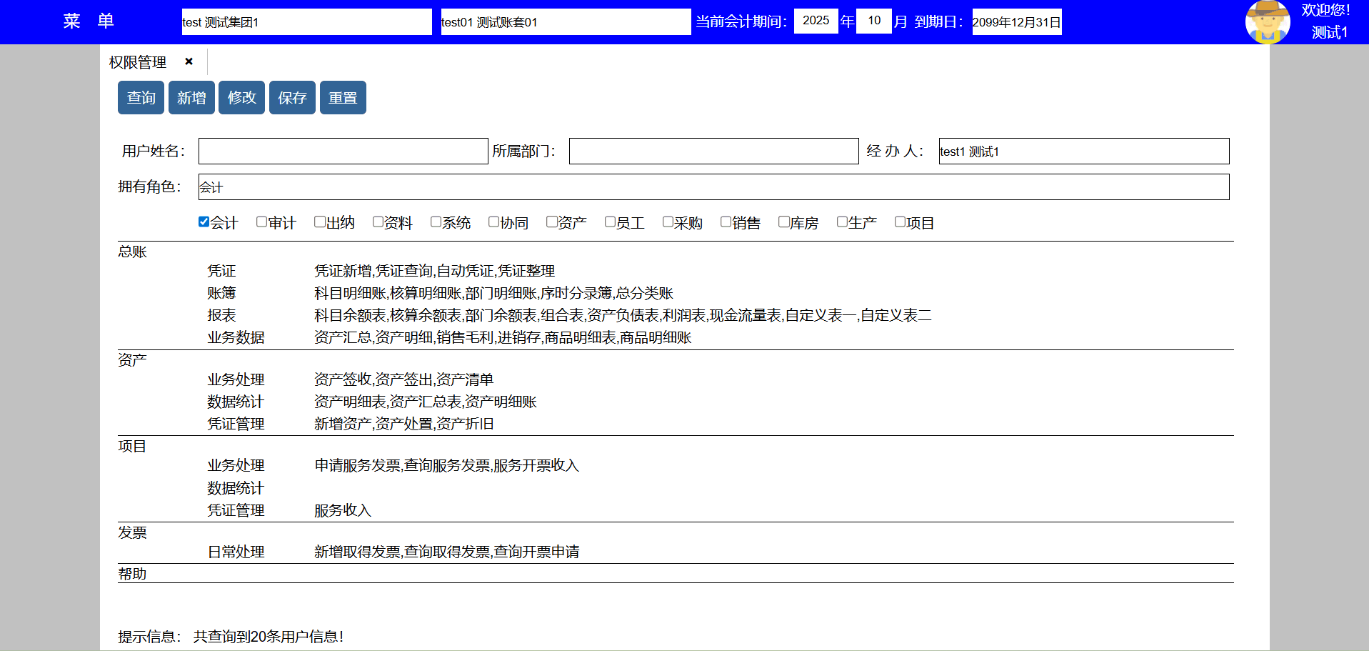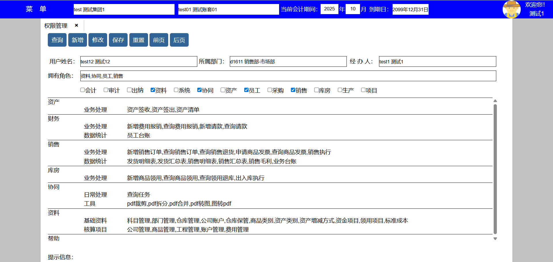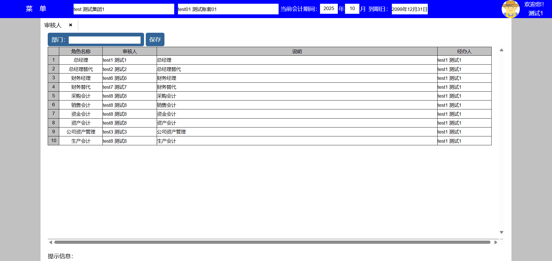 | test141 | test141 | 财务部 | 员工,人事,会计,资料,系统,资产,采购,销售,库房,生产,项目,发票 | 财务经理 |