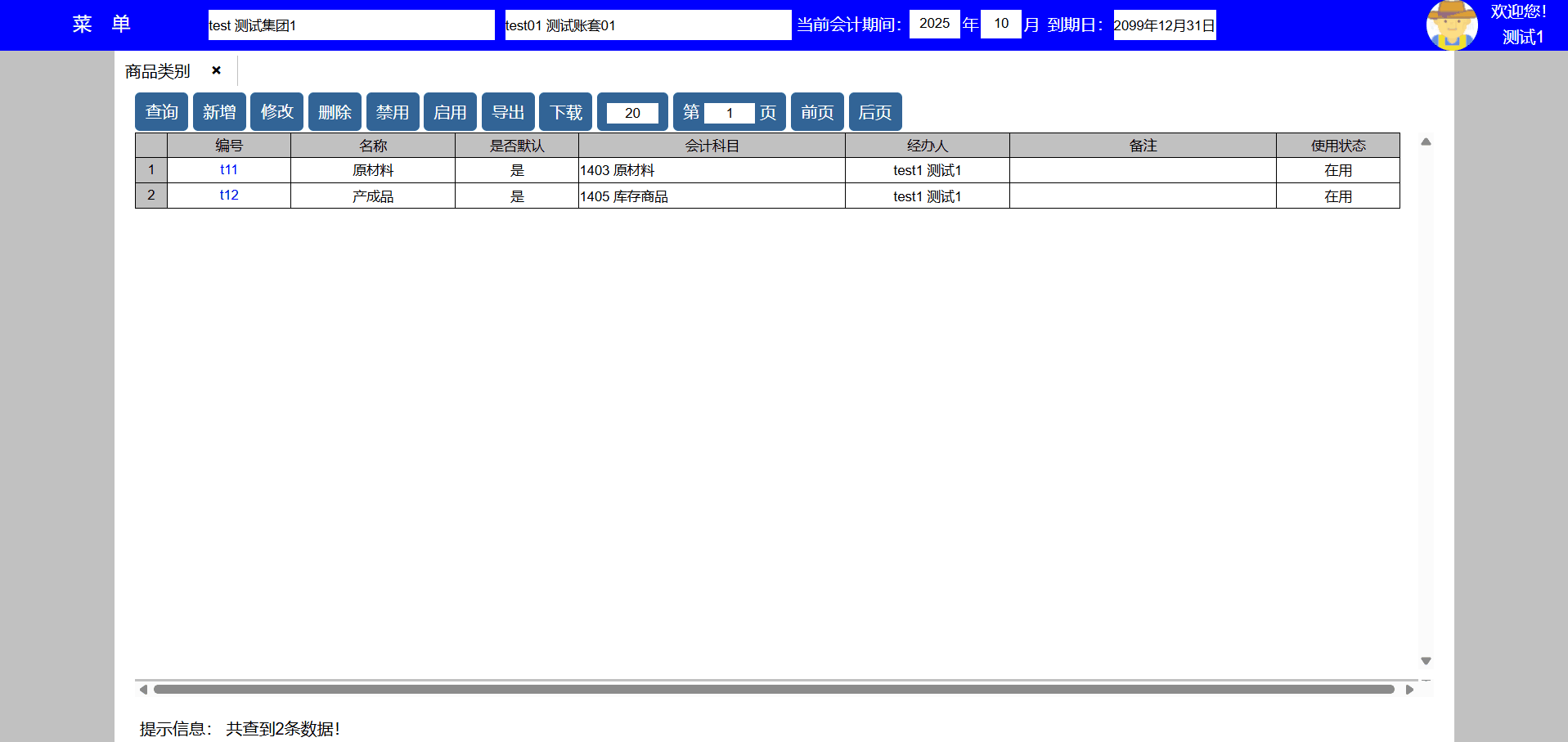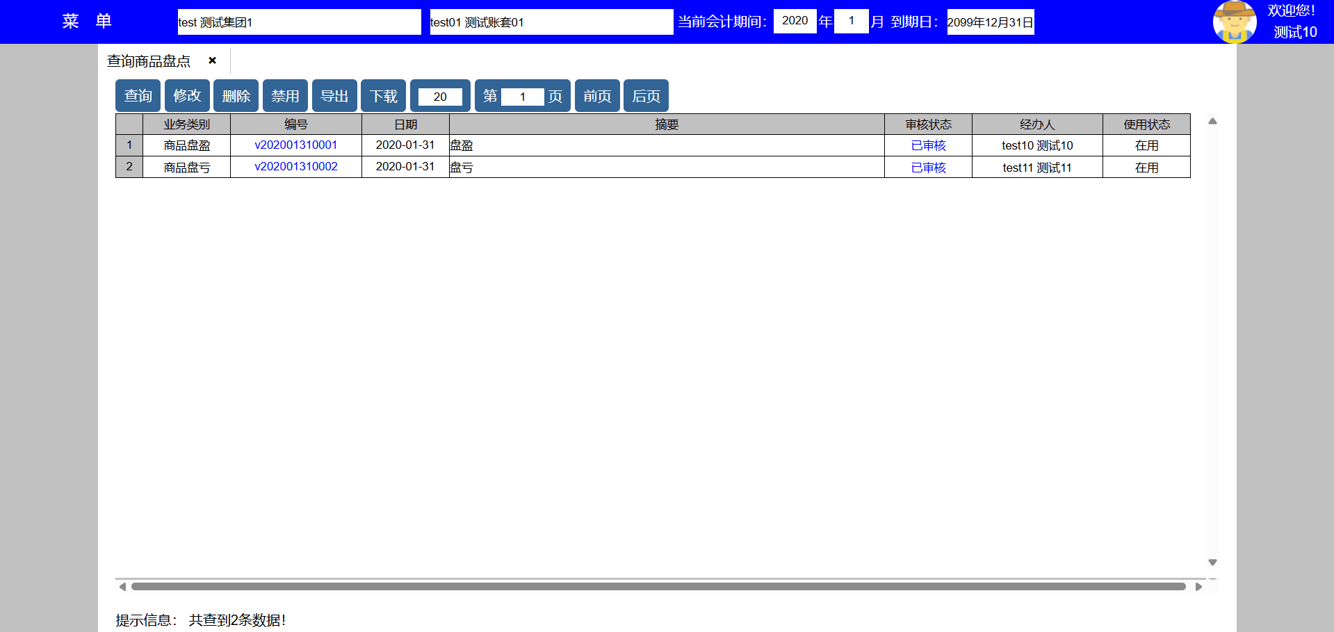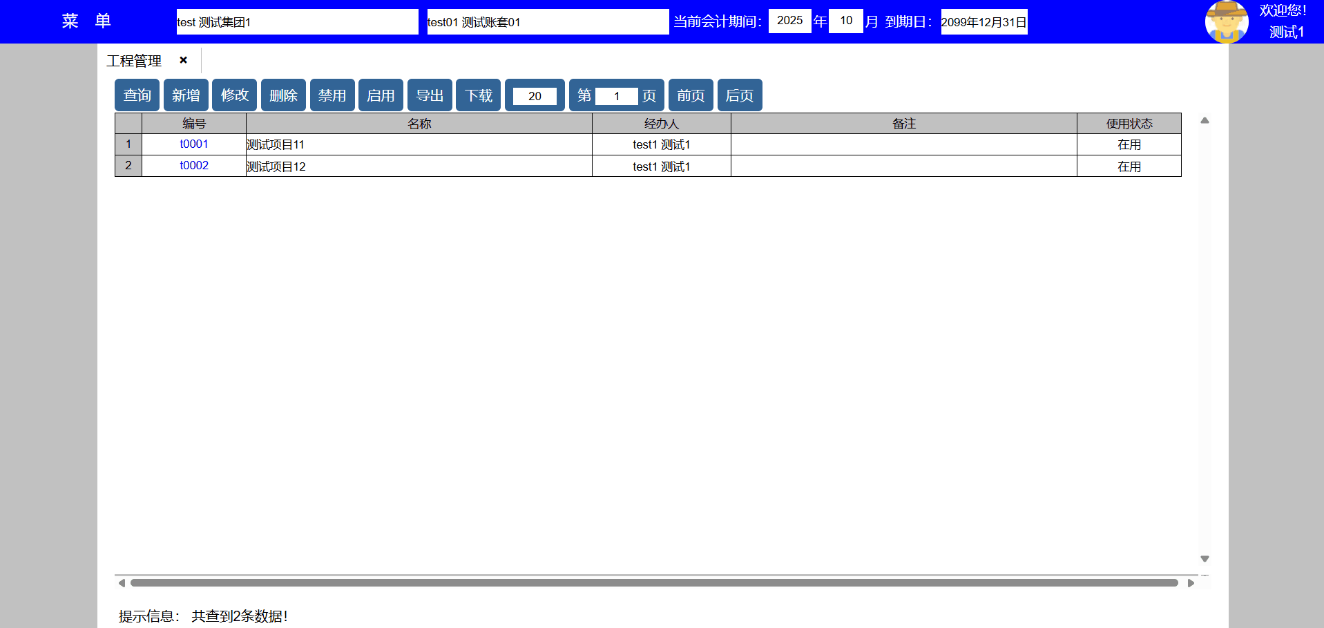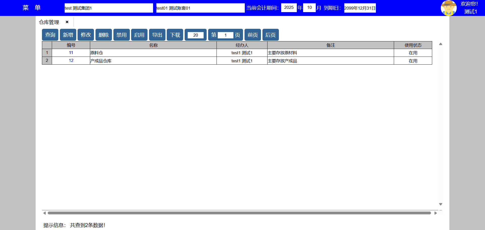 主要功能:1、查询、新增、修改、禁用、导出、下载、每页显示行数、显示页数、向前翻页、向后翻页。