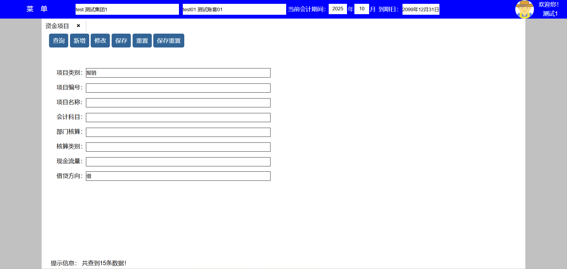 2、点击新增按键可新增资金项目,并转到新增页面,项目类别报销用于费用报销,请款用于请款,回款用于回款确认, 会计科目为该资金项目收付款时的对方会计科目,部门核算、核算类别、核算项目为会计科目辅助核算内容, 现金流量为该资金项目对应的现金流量表项目;