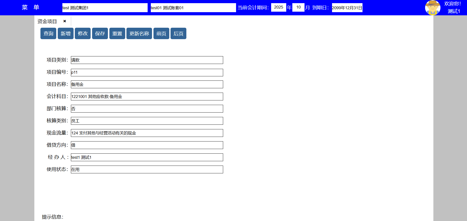 3、选择资金项目后点击修改按键可对该资金项目进行修改,并转到修改页面,点击更新名称可以将已使用该资金项目的历史 数据全部更新为新的资金项目名称;