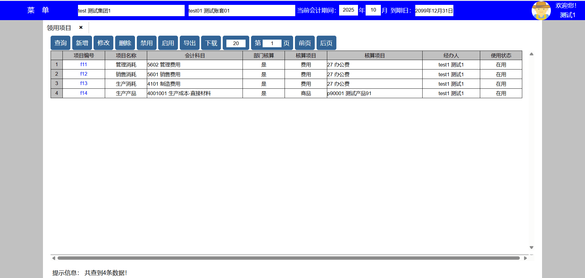 5、选择领用项目后点击禁用按键可以禁用该领用项目,禁用后新增业务不能使用该领用项目,但可以查询使用该领用项目的历史数据;