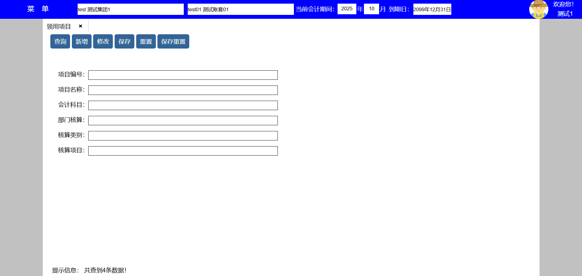 2、点击新增按键可新增领用项目,并转到新增页面,领用项目用于商品领用,会计科目为商品领用时该领用项目的对应会计科目, 部门核算、核算类别、核算项目为会计科目辅助核算内容;