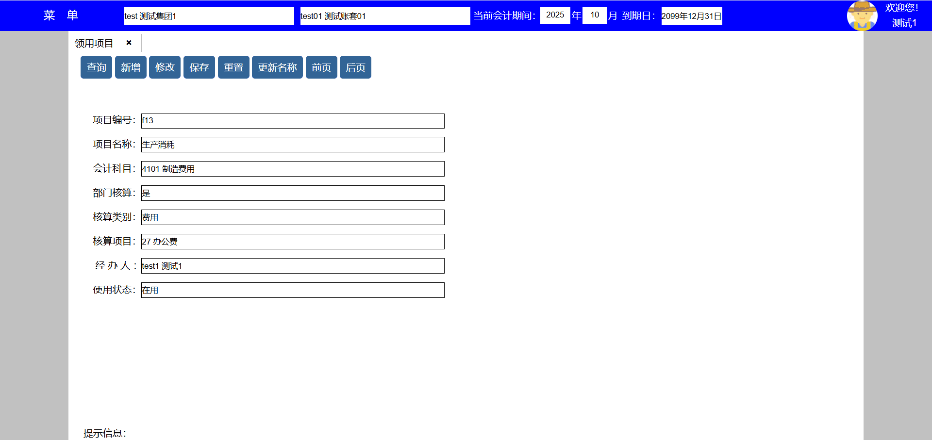 3、选择领用项目后点击修改按键可对该领用项目进行修改,并转到修改页面,点击更新名称可以将已使用该领用项目的历史 数据全部更新为新的领用项目名称,修改会计科目后新发生的商品领用会按新的会计科目匹配,不会影响历史数据;