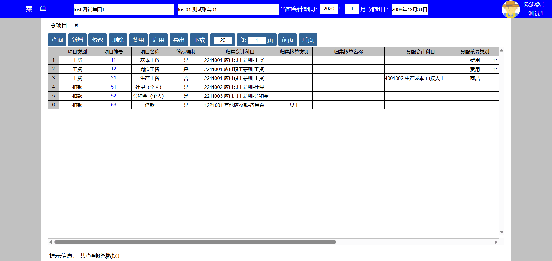 5、选择工资项目后点击禁用按键可以禁用该工资项目,禁用后新编制工资表不能使用该工资项目,但可以查询使用该工资项目的历史数据;