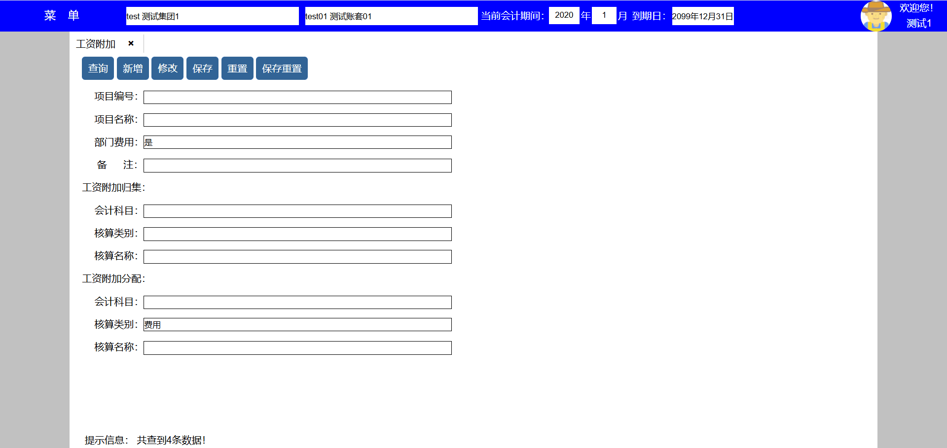 2、点击新增按键可新增工资附加项目,并转到新增页面,工资附加项目用于编制工资附加,工资附加归集是指归集工资附加费用的会计科目, 工资附加分配是指承担工资附加费用的会计科目,分配计入部门费用的工资附加项目,不用设置工资附加分配会计科目, 但必须先设置部门费用会计科目,编制工资时系统会按费用所属部门自动匹配会计科目;