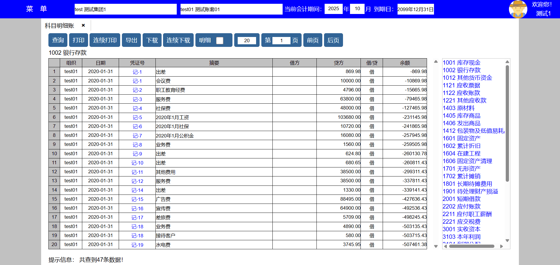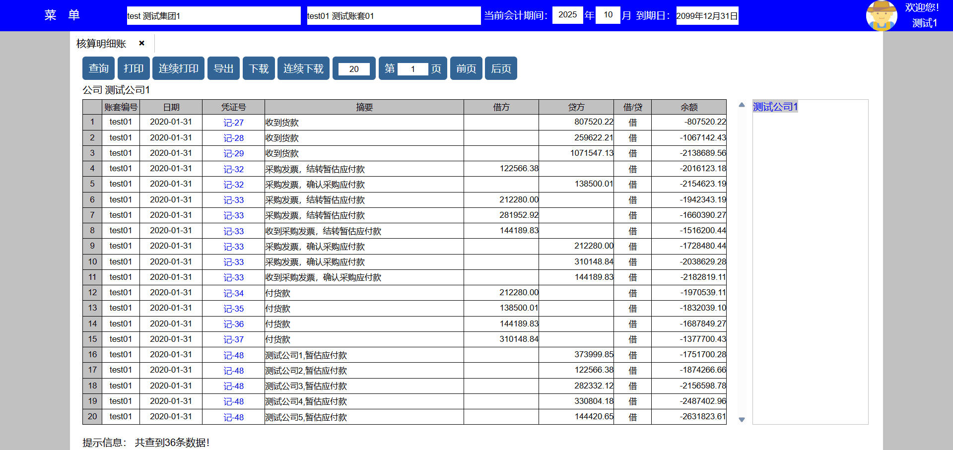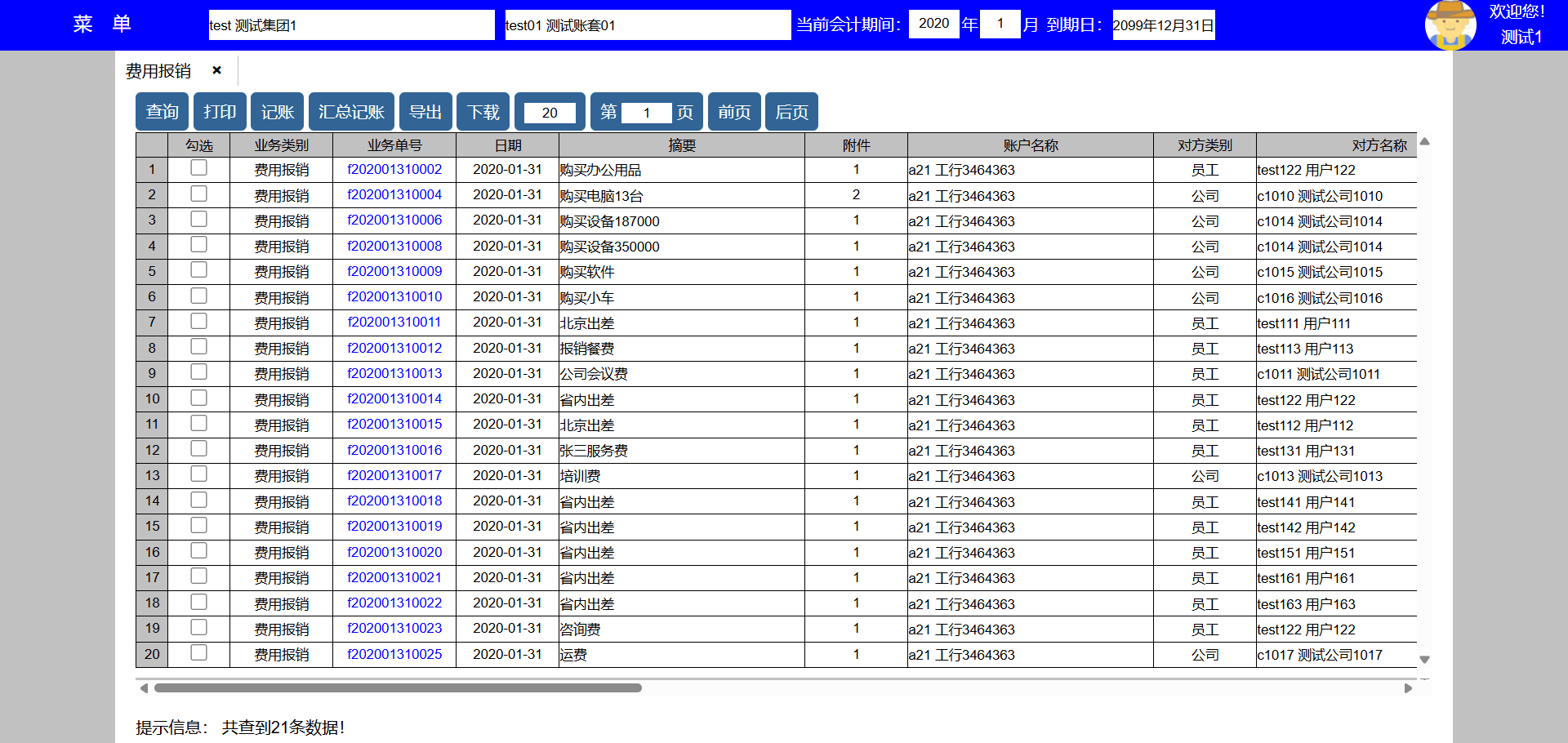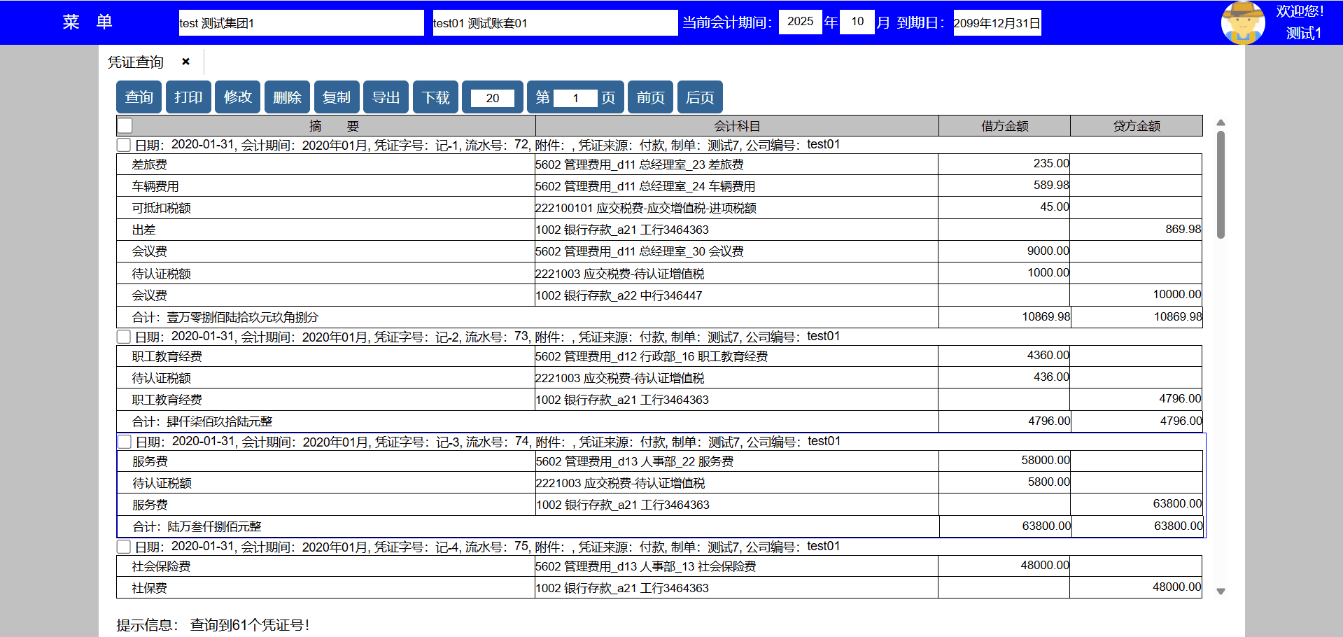 主要功能:查询、打印、修改、删除、复制、导出、下载、每页显示凭证数量、显示页数、向前翻页、向后翻页。