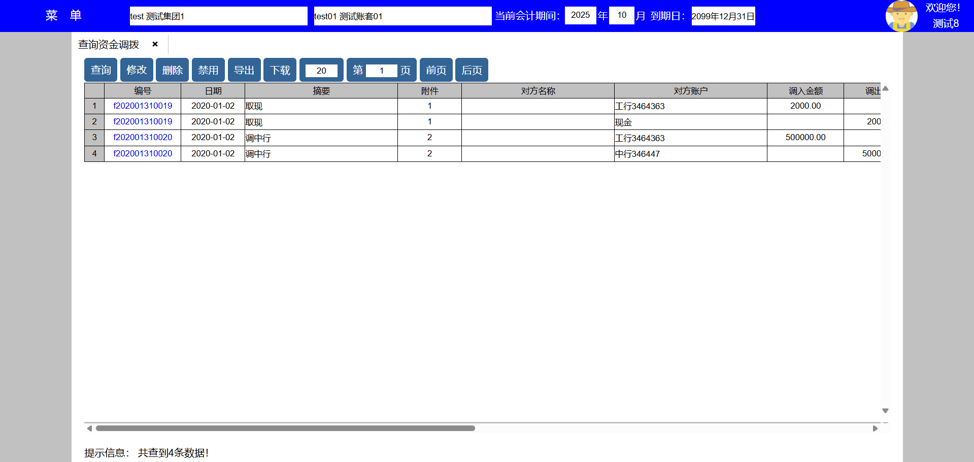5、选择资金项目后点击禁用按键可以禁用该资金项目,禁用后新增业务不能使用该资金项目,但可以查询使用该资金项目的历史数据;
