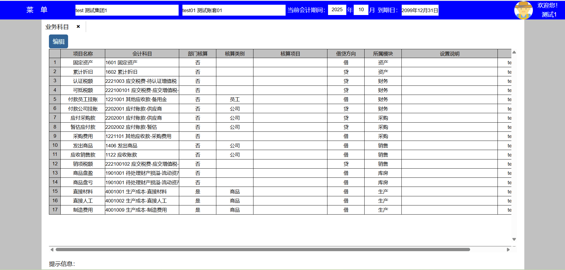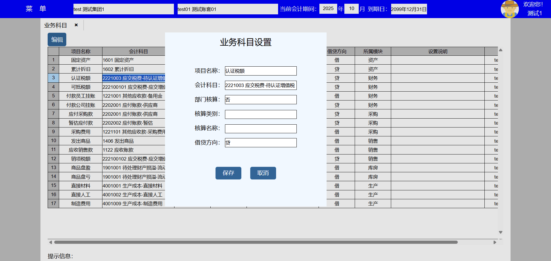 2、选择项目名称行,点击编辑按键可以编辑该项目,设置对应的会计科目及其辅助核算,用于业务系统生成会计凭证;