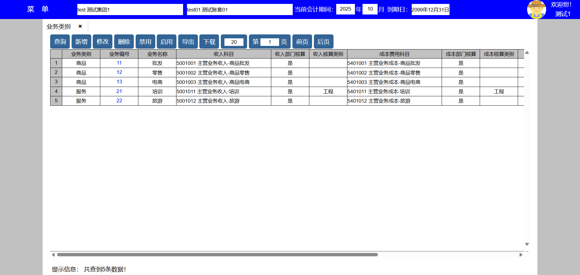 5、选择业务类别后点击禁用按键可以禁用该业务类别,禁用后新增业务不能使用该业务类别,但可以查询使用该业务类别的历史数据;