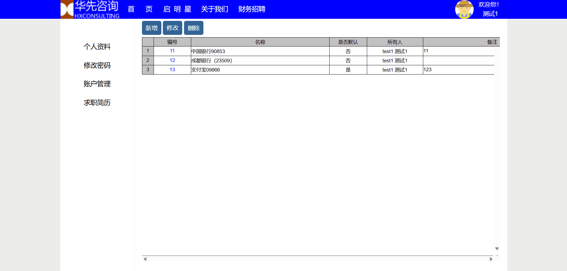 主要功能:1、查询、新增、修改、删除个人账户。